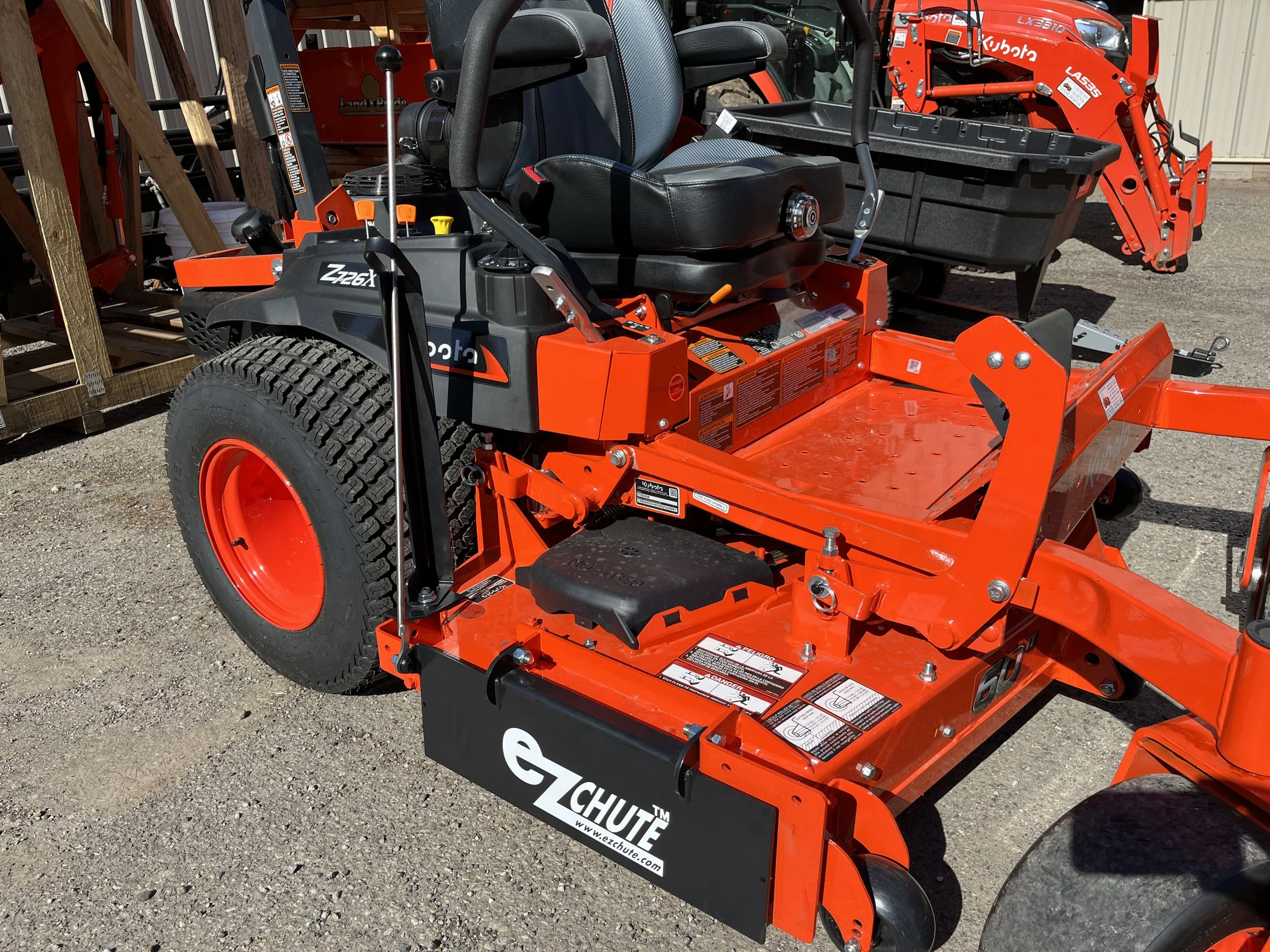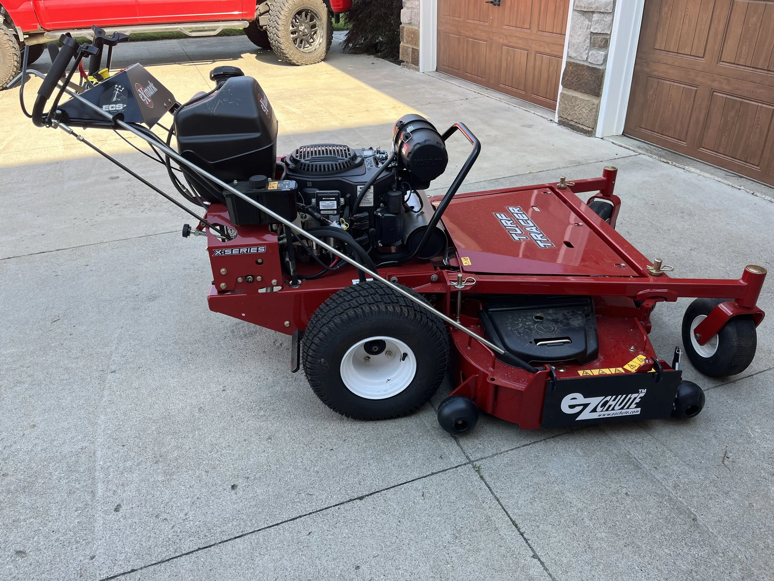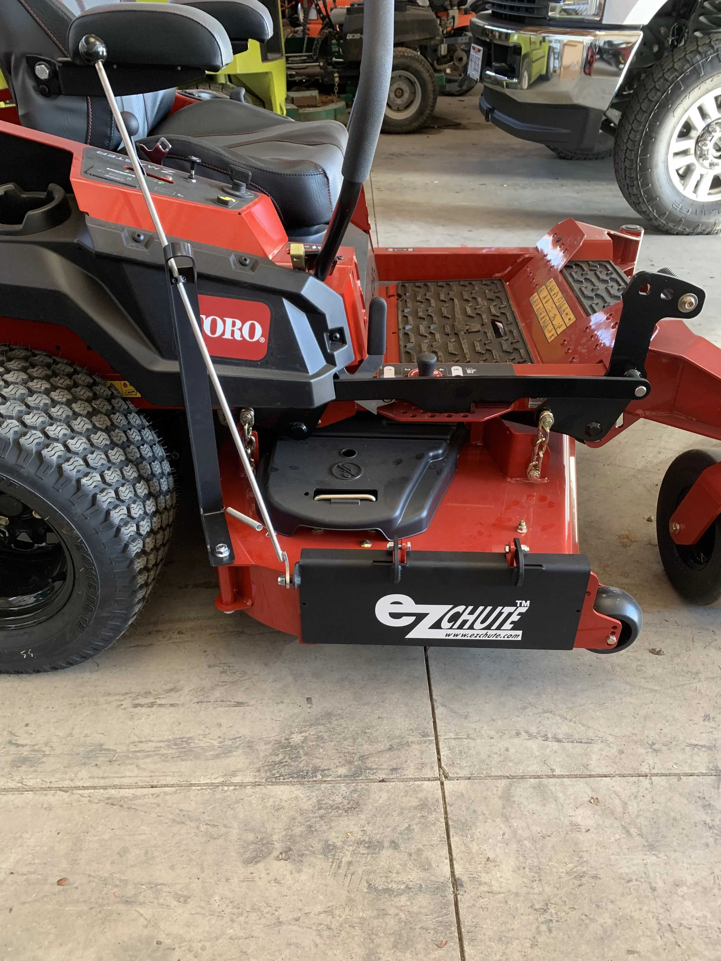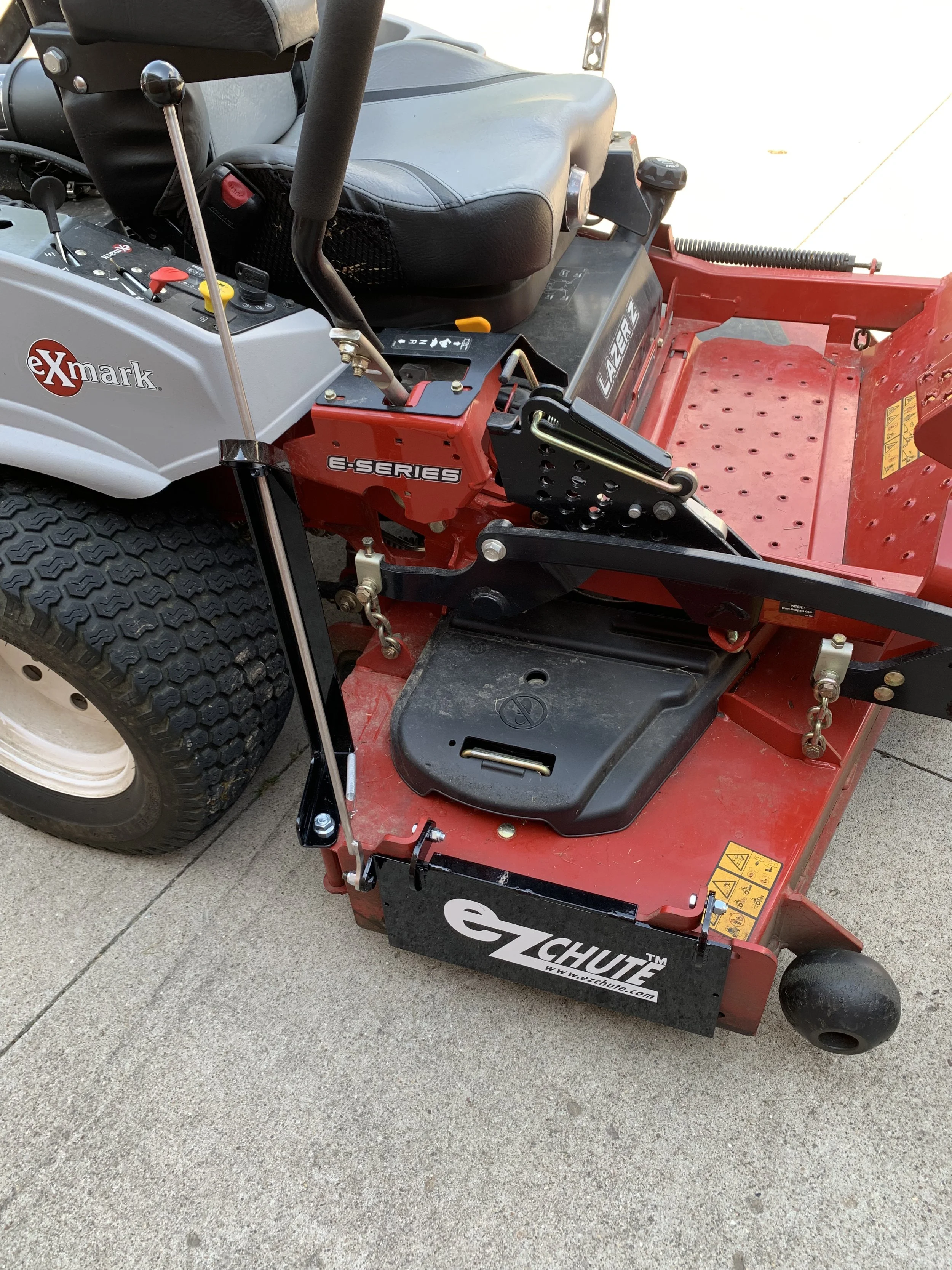 The ezchute is an operator-controlled discharge chute that makes mowing faster, cleaner, and easier. With a quick lift of the handle, you can switch from discharging to mulching, saving time and money by reducing cleanup around driveways, sidewalks, pools, landscaping, and vehicles. Flipping the chute down keeps clippings out of unwanted areas, while mowing with it open in larger spaces spreads grass evenly without windrows. Unlike mulch plates or bagging systems, the ezchute is always ready to use and folds neatly out of the way when open, so it won’t interfere with low shrubs or overhanging obstacles.